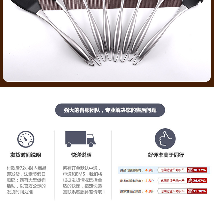 套裝明細(xì):撈籬、湯勺、意粉勺、漏鏟、刮刀、勺子、面包夾打蛋器
