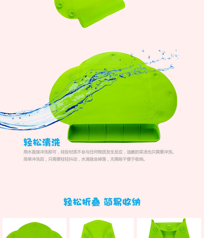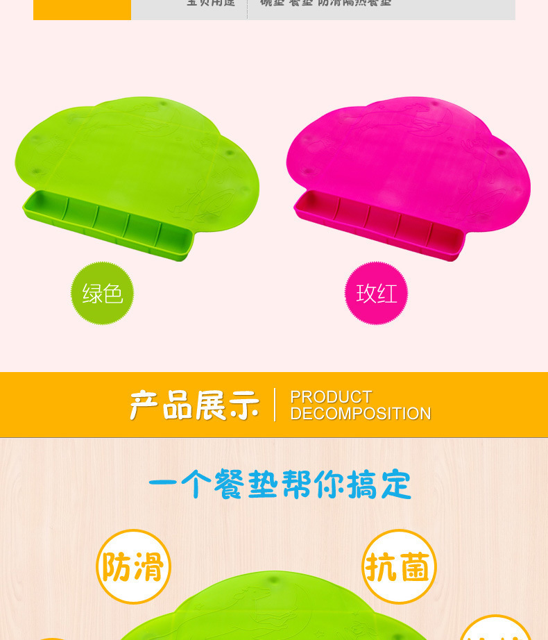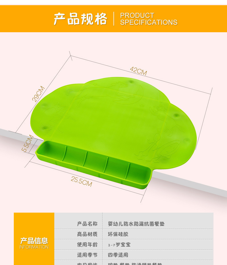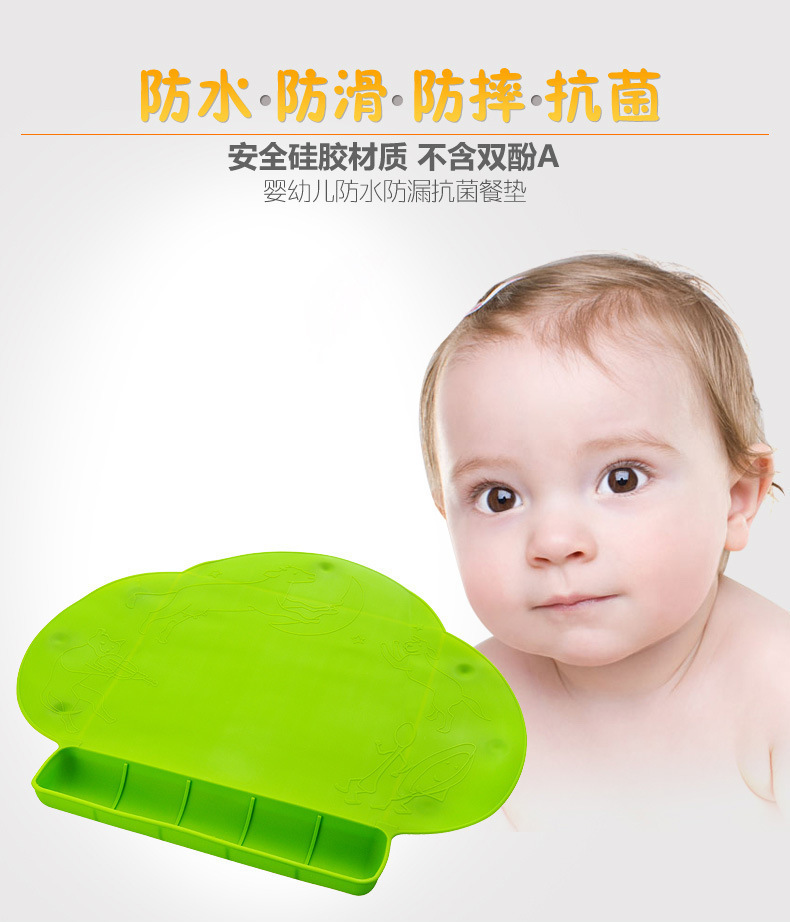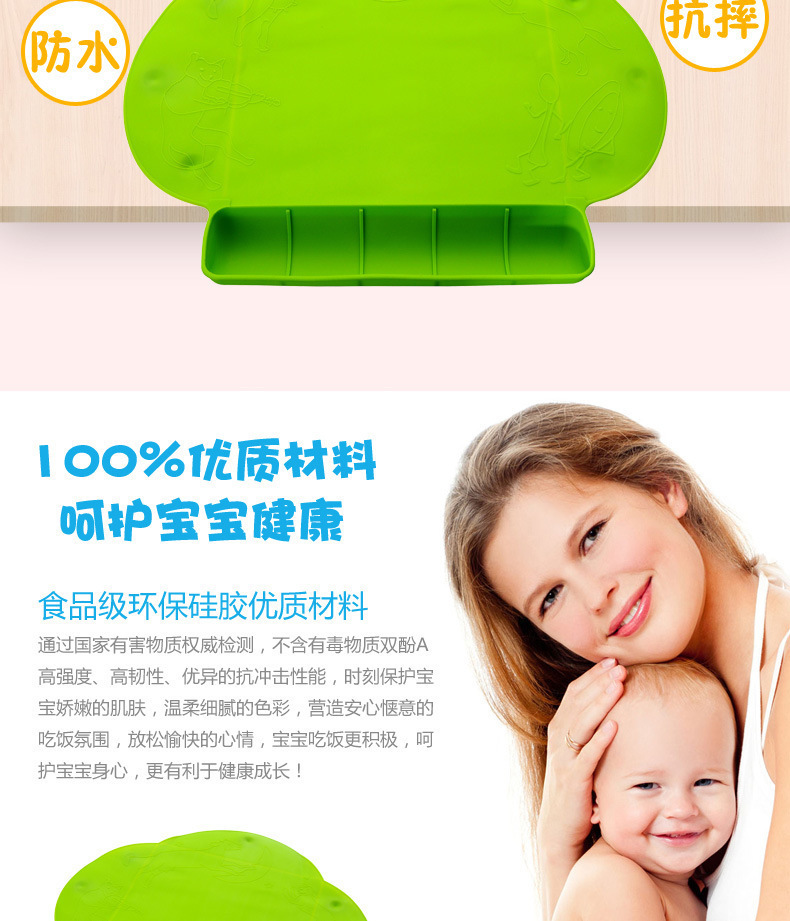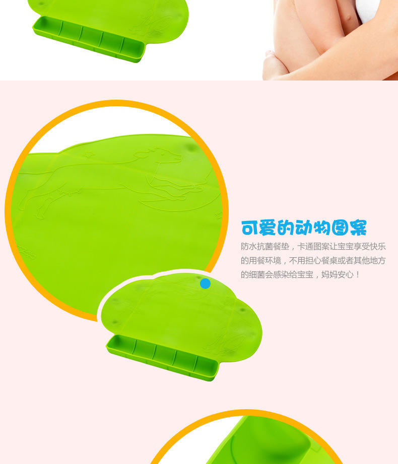3、防水抗菌餐墊,卡通圖案讓寶寶享受快樂的用餐環(huán)境,不用擔心餐桌或者其他地方的細菌會感染給寶寶,媽媽安心!